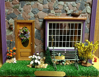 Late spring in Michigan, both in the realm and dollhouse. The forsythia is blooming. The spring door wreath is up. (All the wreaths are from