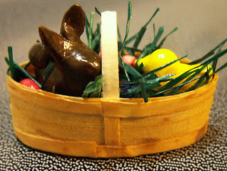 A close-up of the basket, complete with eggs, chocolate bunny and marshmallow chick.