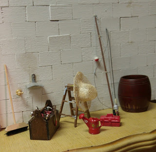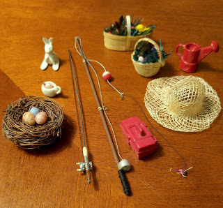 The spring set before installation. I made the White Rabbit, the egg dye cup and the baskets. The other pieces were to go in my garden shed which I haven't yet gotten around to building.