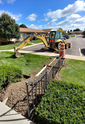 Meanwhile back at the now 1-story 3sL HQ, still cracked was the cracked step that was noted on the Spring Walkabout repair list in...the spring. Visiting my father on Weds., my phone rang. It was the contractor letting me know the cement would be fixed tomorrow. I hung up. Cracked up. What's funny? Dad asked. I told him. He said, oh that's not a problem. I can write this script now. He's not going to respond well when I get out of the car after retrieving him, say OK, here's the not a problem, and vault myself and Scott into the house, leaving him to contemplate the not a problem part of the world where all the problems belong to someone else to solve. In this case, it'll probably be the South Lyon Fire Department Egress Team. Again.