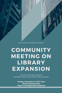 P { margin-bottom: 0.08in; }A:link { }17 September, Sunday was the first community meeting to discuss the expansion of the Salem-South Lyon District Library. The next meeting is Tuesday 26 September 7:00 p.m.The discussions are preliminary; the purpose of the community gathering to assess program needs, gather input from district stakeholders and patrons, and involve the community in moving forward.