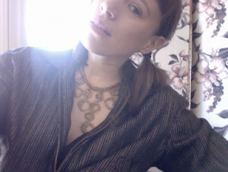 Vintage 1940's car jacket in black and metallic. Brass and turquoise grecian necklace.