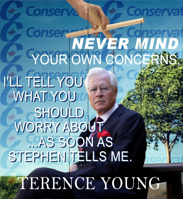 Never once when I've emailed Terence Young (my local MP) with concerns has he offered an actual response to the issues I've contacted him about. On each and every occasion his reply has instead told me what my concerns should be and/or has trotted out the official Conservative Party line. Stephen Harper must love this guy to bits. He's a faithful little Tory puppet with no thoughts of his own. Heck, he even looks much like a Harper clone.