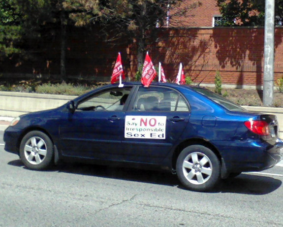 Yesterday Paddy and I were driving along Hurontario (near Steeles Avenue) through Brampton and noticed a cavalcade of cars sporting red flags and stickers. They seemed to be protesting something and I was straining to read the text on the flags when we cruised by a car with a large sticker plastered across one of the back doors. “SAY NO TO IRRESPONSIBLE SEX ED,” it commanded, not understanding the irony it was presenting. You see, irresponsible sex ed is what we had in Ontario for years. Until this coming fall, in fact, this province had the oldest sex ed curriculum in Canada, one from way back in 1998. We were originally supposed to get a new curriculum in 2010, but the Ontario government got spooked by a backlash from religious groups and a small minority of parents.