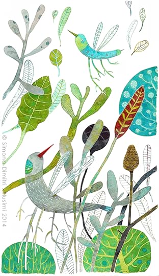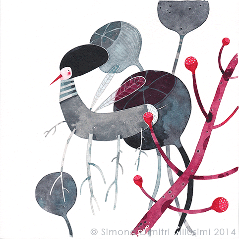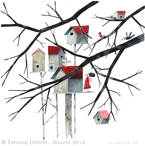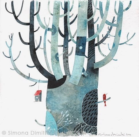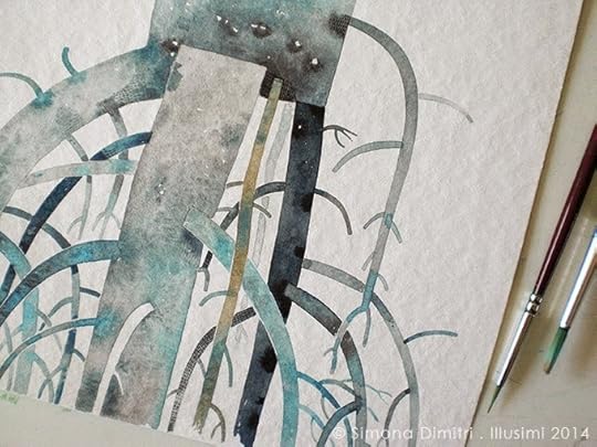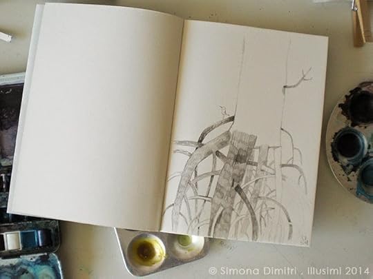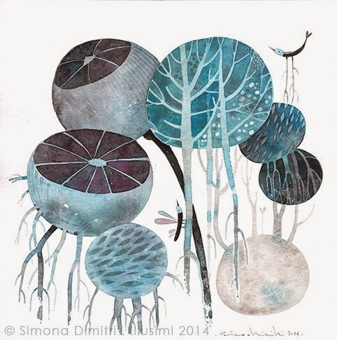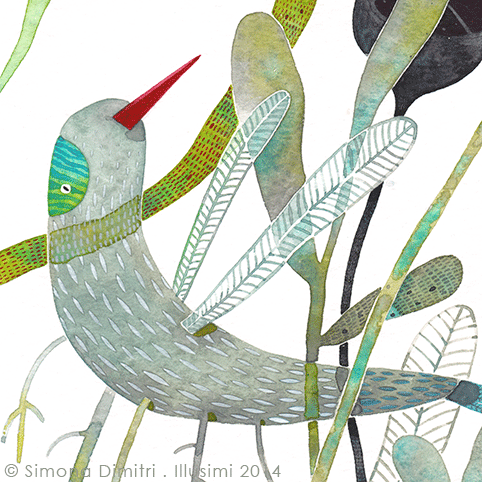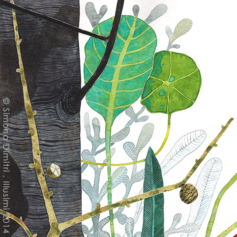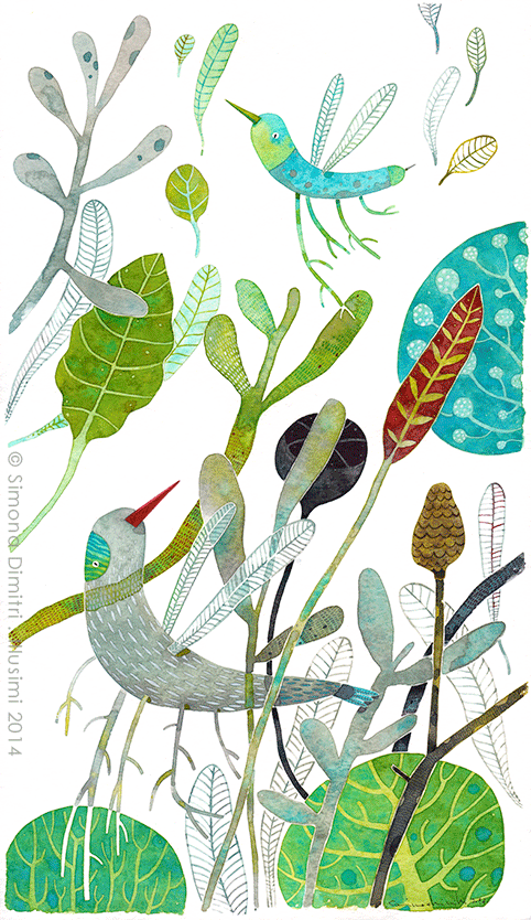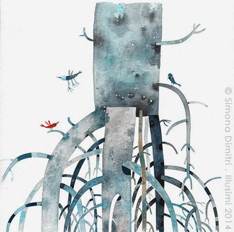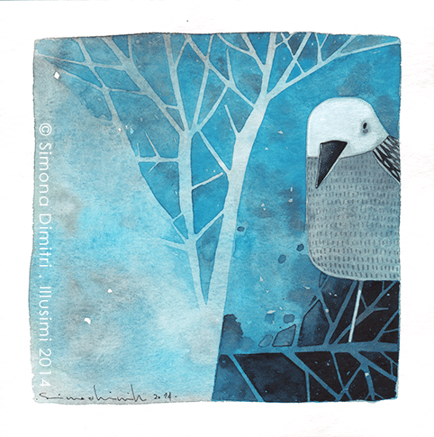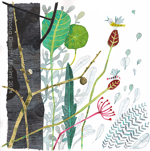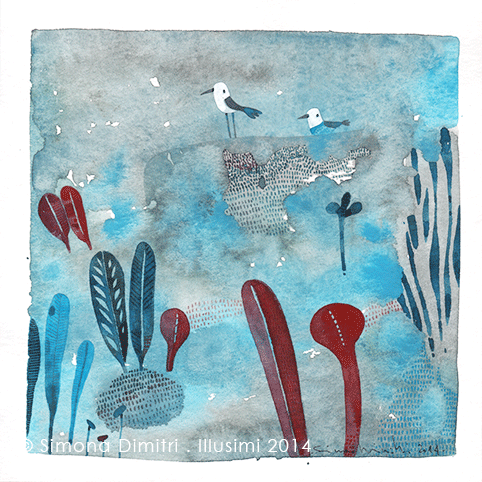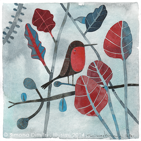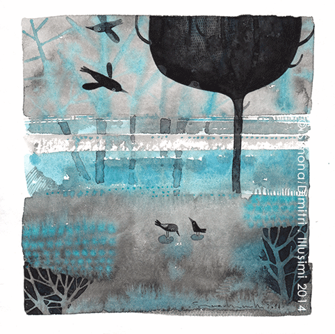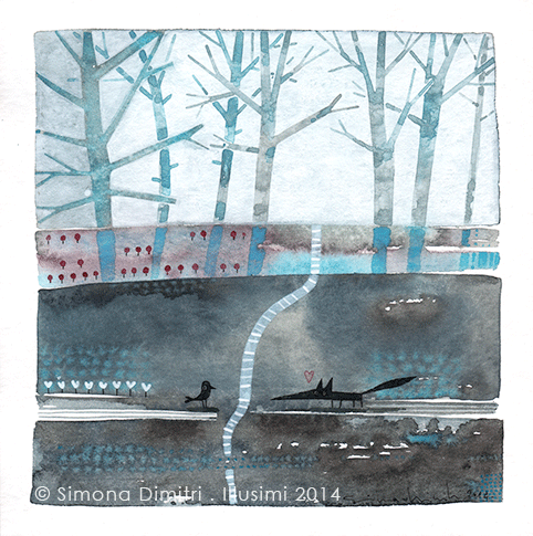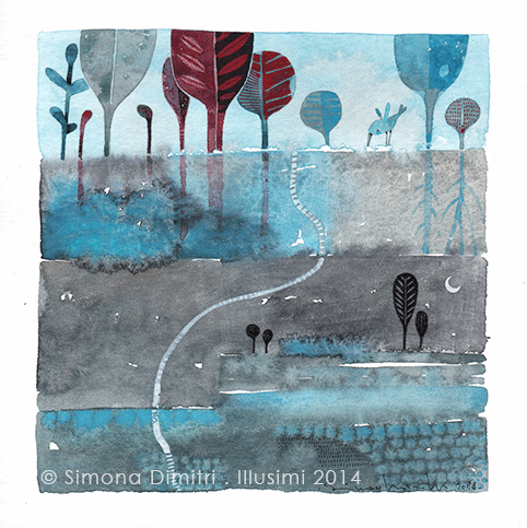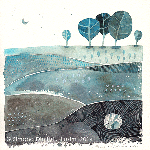 the sea shore many different frequencies, just one world quiet evening night in the wood robin a clearing among the trees my den, inside the hill countryside (watercolours/mixed media on cotton paper, 15x15 cm)