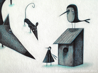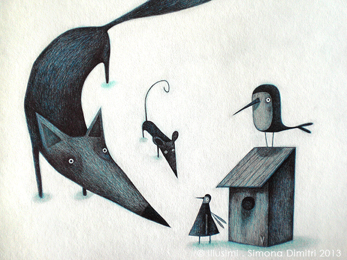 the robin, the fox, the mouse and the winged human- outside his birdhouse in the wood