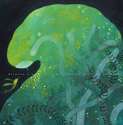 " uncharted world ::: watery slow movements " " Green Thing & the yellow bird " mixed media on grey heavy cardboard 40x40cmavailable NOW in my [online shop] shipping worldwide [ BIG artworks ]