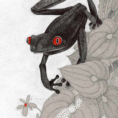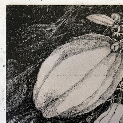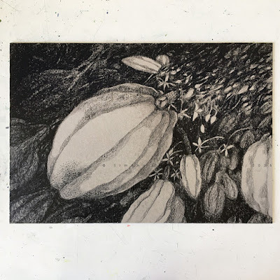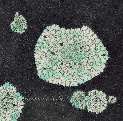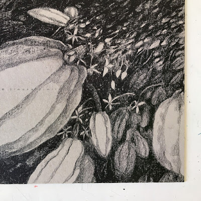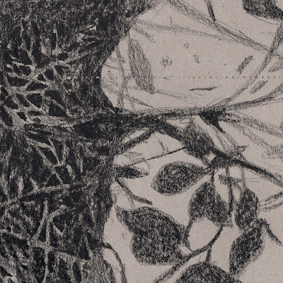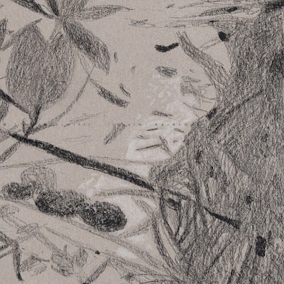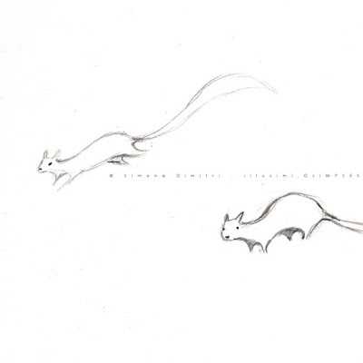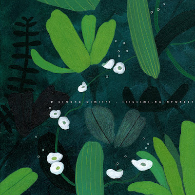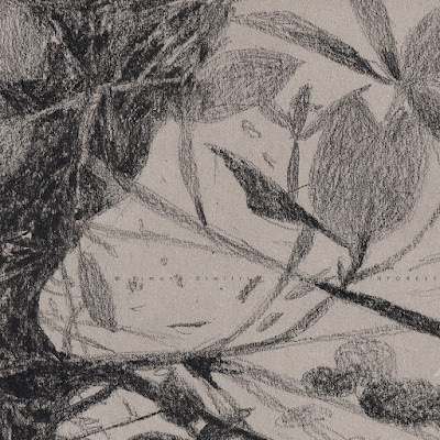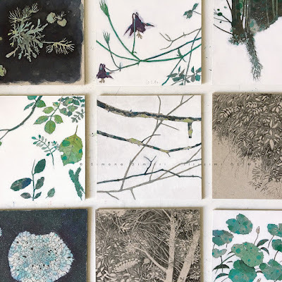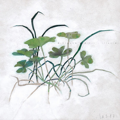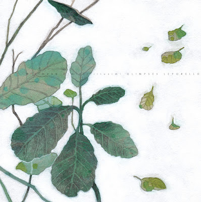 "so tiny thing" one of the first postcardsin the serie, a fragment from "Glimpses",one of the remembrance of the woods,this tiny plant who grow in the freshshadow of the trees. The original artwork, a mixture of pencil,watercolour and acrylic white on greyheavy cardboard —still visible in its texture here and there. "Glimpses" original artworks still with me,the whole of them, togather with sketchesand the artworks which remained aside,hidden...
