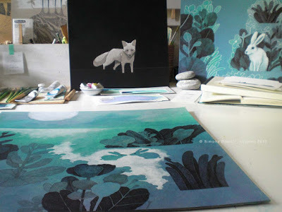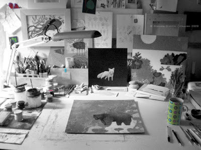 two red hearts on the left, a tiny green flower behind the lamp,the turquoise adhesive tape holding a note about wolveseating the wind in winter, and my cup of 'something" working table