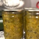 PrintFresh Garden Zucchini RelishThis recipe puts the zing in zucchini with just enough spice and tang. Delicious on burgers, hot dogs, cooked pinto beans, and more. Course CondimentCuisine AmericanKeyword relish, zucchiniEquipmentHot water bath canner and related utensils6 Half pint jars, lids, and rimsIngredients5 cups shredded zucchini (Wash thoroughly. No need to peel.)1.5 cups red onion, shredded1 large bell pepper (Use red or yellow pepper for added color)1 large banana pepper1/4 cup shredded carrot 2.5 T salt1.5 cups sugar1/2 tsp turmeric1/2 tsp ground mustard seed1/2 tsp restaurant grind black pepper1/2 tsp celery seed1.5 cups apple cider vinegarInstructionsShred zucchini, red onion, bell and banana peppers, and carrot by hand or in a food processor. Place in a large bowl. Add salt, mix well, and cover. Let stand at room temperature for eight to ten hours. Transfer veggies to a colander and rinse thoroughly with water. Strain out as much water as possible and transfer to medium-sized stockpot. Add spices and apple cider vinegar; mix well. Bring to boil, reduce heat, and hold at a gentle boil for 30 minutes, stirring occasionally. Transfer hot mixture to warm, sterilized jars. Add lids and rims. Simmer in a h0t water bath for twenty minutes. Carefully pull jars out of hot water and set on a heat resistant surface. Let rest for twelve to twenty-four hours at room temperature so lids will seal.