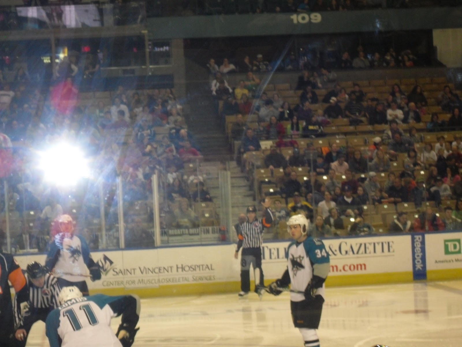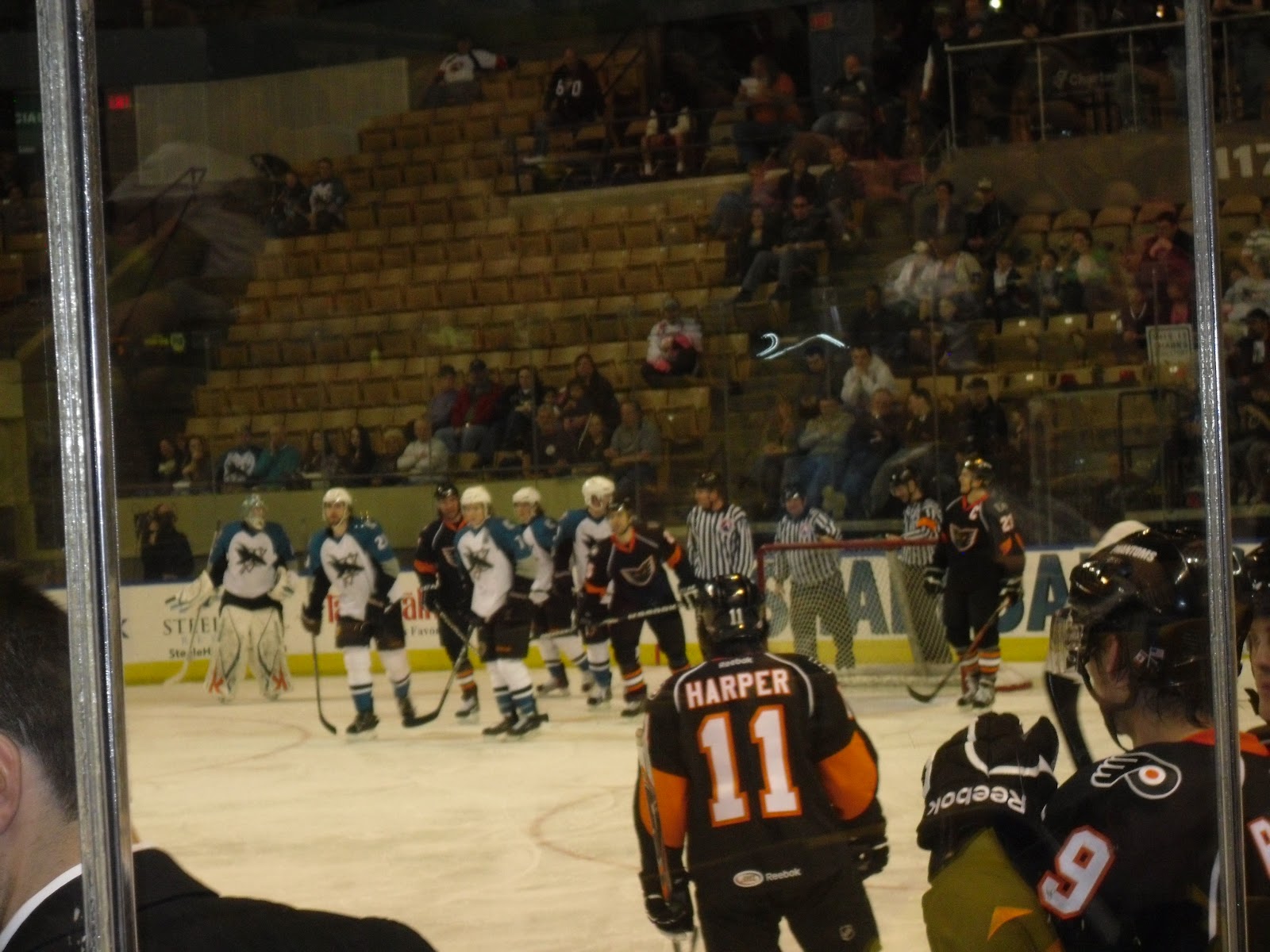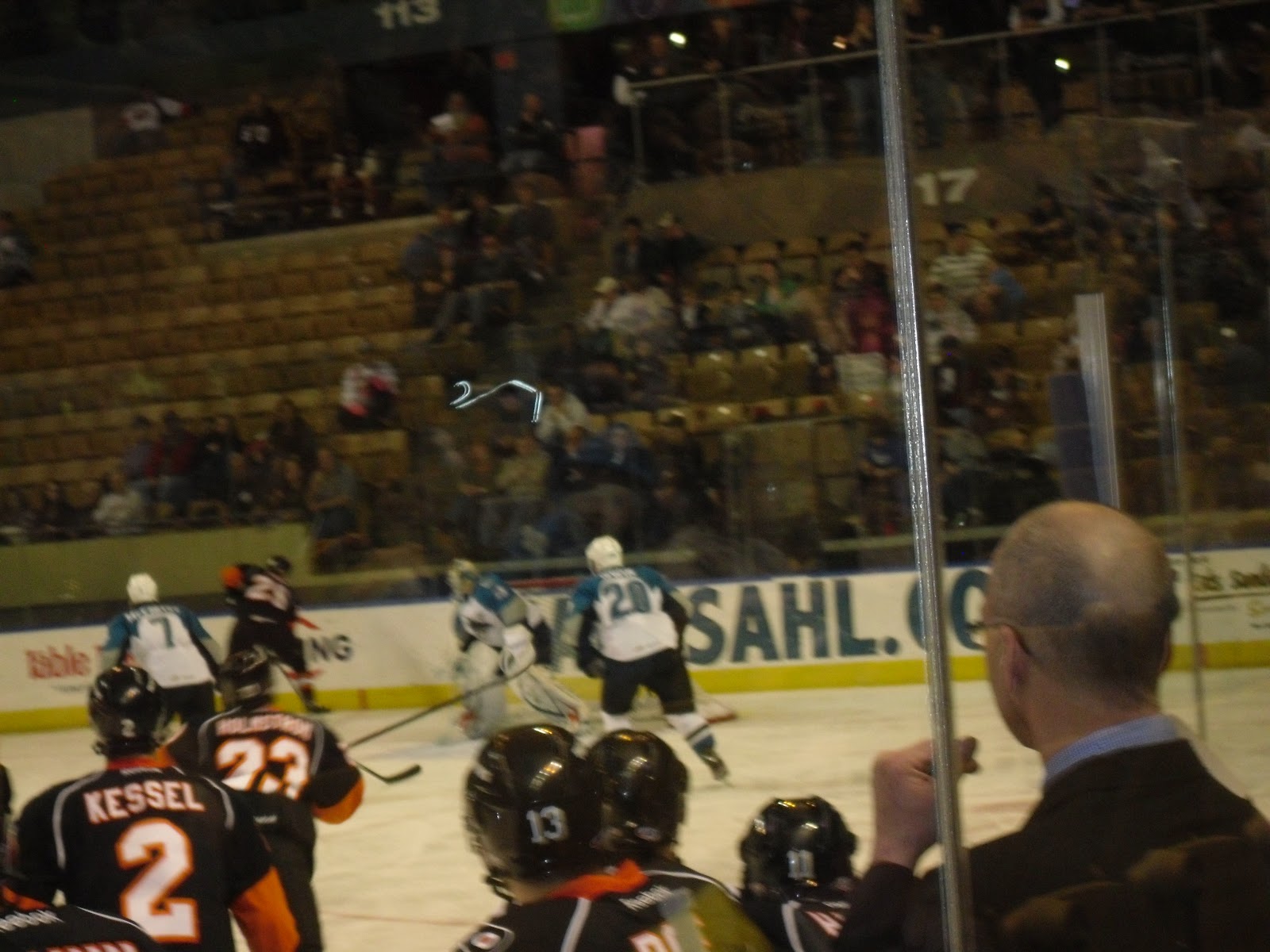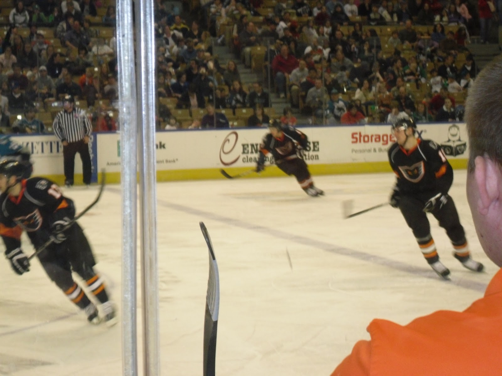 I gave Kitty the camera and let her take a few pictures.Halfway through the game her sister was asking when it was going to be over, but Kitty was reading the names on the program and trying to find the guys on the benches, which were right in front of us. We had awesome seats. So close that when one of the players on the opposing team swore she heard and said he should have had to go in the penalty box.