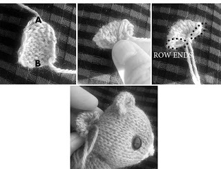 Place the ear to the head and carefully join the row ends either side of the centre point stitch onto the head in a slight curve.