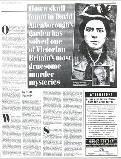 Last weekend, a human skull was dug up in the garden of broadcaster/naturalist Sir David Attenborough in London. It turns out to be the long-missing head of an 1879 murder victim named Martha Thomas, who was killed by her maid Kate Webster.
