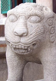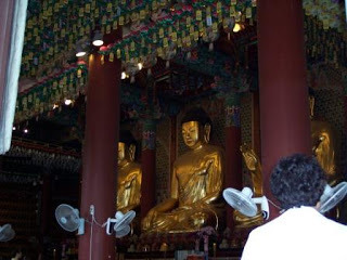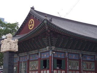 I then strolled through Insa-dong, a touristy area near my hotel that has lots of kitschy shops and art galleries. It used to be a chic neighborhood for galleries and antiques, but that seems to have been lost. Lots of restaurants now, and tourists. My real target, though, was the nearby Jogye-sa, the main temple of the Jogye sect of Korean Buddhism, which claims to be the largest sect in the country. (Korean Zen, or Seon, Buddhism is also big -- I may try to get to a Seon temple today, although the one I know about is outside the main city.)