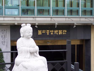 National Museum of Korea (from Main Gate)Entry to the permanent exhibits is free, and I started on the first of three floors, which illustrates the history of Korea from paleolithic times through the founding of modern Korea. I found that fascinating, and a valuable refresher for my long forgotten reading about the various kingdoms and unified states and conflicts with Japan and China. I then went up to the third floor, which is devoted to Sculpture and Crafts, including a large gallery of Buddhist sculpture. I spent a lot of time there, and also in the Celadon gallery. Across the hall there are galleries devoted to the arts of other Asian countries, and I strolled through, although I didn't linger.
