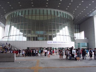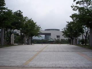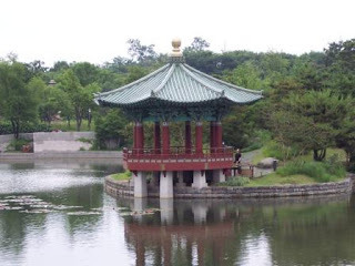 It was cloudy and very humid all day on Friday, but it didn't rain. After I did some work in the morning, I walked the block to the Seoul Metro stop, figured out what was what (they've got great ticket dispensing machines that switch to English at the press of an on-screen button), paid my money (1000 won, or about $1, plus a deposit of 500 won), and boarded the train. I had to switch lines, which was no problem, and pretty soon I was walking toward the "new" National Museum of Korea.