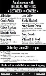 Libraries are wonderful places, and I was delighted when the Staunton Public Library invited me to participate in “Between the Covers,” an event with 10 local authors.