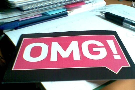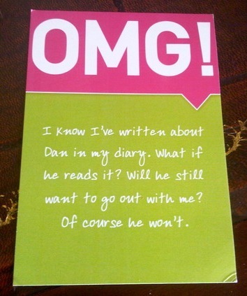 The first teaser postcards for Della Says: OMG! went out last week (or possibly the week before, I'm all upskittled* with the Easter weekend). My lovely friend Luisa sent me this very artfully posed picture, which made me *squee*. I'm not sure exactly who they've been sent to, but lots of lovely book bloggers got one, so that's good.