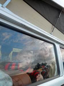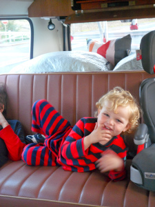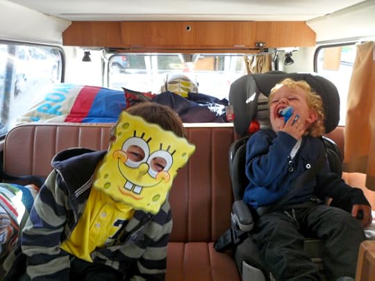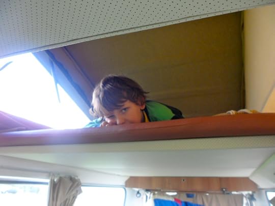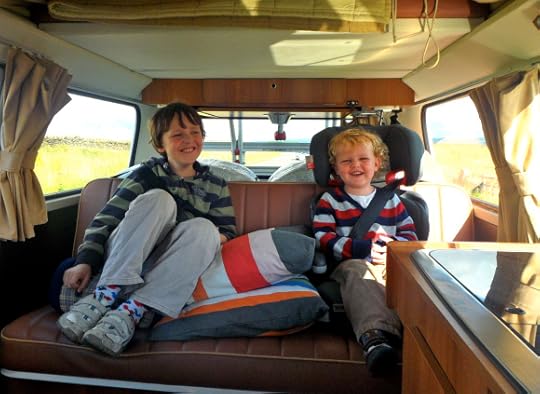 Harry had chosen to sleep in the roof and David volunteered to sleep up there with him, while Joe and I slept “downstairs.” I worried that the roof space would collapse and Harry and David would fall on us in the night, but, you know, that didn’t happen. It was rainy and very windy, but the boys slept well and I slept much better than I expected to, despite dreaming that the van had blown into the next field. I was woken by Joe saying, “Is it morning-time, Mama? Can we keep this camping van?”