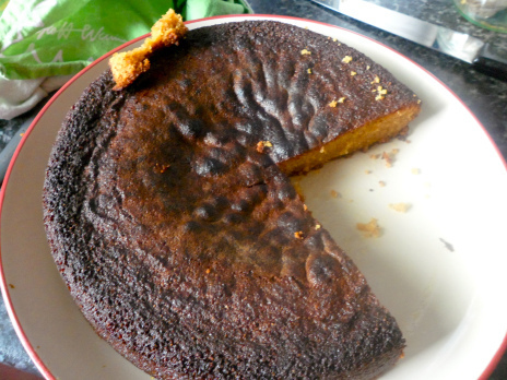 The recipe said to cook it for an hour, but after 40 minutes I could smell burning. I opened the oven to find there was a good reason for that – it was extremely brown and almost black around the edges. But when I cut into it, the inside looked fine.
