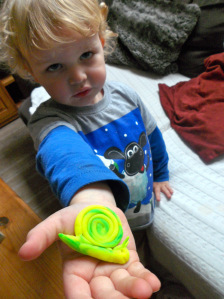So I made one from Playdoh. And Joe was delighted with it. No, really, he was. (Ever heard that expression “He should tell his face?” Yes.)