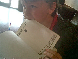So this week, I told Harry he could do whatever he wanted. If he didn’t want to work at all, that was fine with me. We’d still go to Starbucks, but we could just sit and chat. I got his Friday bag and took all the stuff out and spread it out on the floor. There was quite a lot. A Carol Vorderman times tables book, a couple of French books and a Learn French CD I’d just bought, a couple of books about plants, the Read Me Out Loud! poetry book, Wreck This Journal, Pick Up Your Pen, The Usborne Write Your Own Story Book and the curriculum stuff that school had given me.