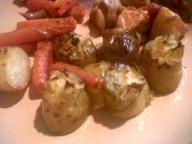 I can't remember where I first read about 'crashed potatoes' but I'm so grateful. They work best with little new potatoes, but I didn't have any of those last night, so I just cut the long thin potatoes we had into three.