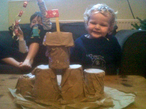 On Monday, Joe wanted to make a sandcastle and I figured we could fashion a sandcastle picture with some brown paper. But then Harry said, "If you want to be even more creative…" and wrapped some brown paper round a cup. So we made a 3D sandcastle and it was ace.