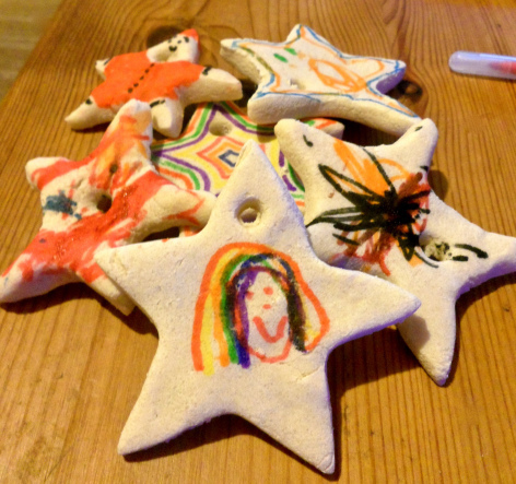 And then, bolstered by the success of the muffins, we made salt dough stars. I've been meaning to make salt dough for ages, but didn't realise it was actually quite as easy as it is. This didn't go quite so well, with Joe getting annoyed when his stars stuck to the table and screwing up Harry's stars in protest, which resulted in him going to bed for a time out and staying there for a two-hour kip! Harry and I finished the stars though and, while they were in the oven, all was peaceful… (Harry watched The Sarah Jane Adventures and Deadly 60, while I watched Parks and Recreation, read Rachel Johnson's A Diary of The Lady, and did the washing up.)