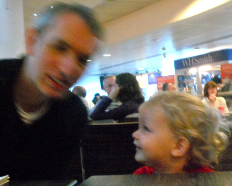 7.30am Checked in at the airport and settled down for breakfast. I love the way Joe's looking at David on the photo.