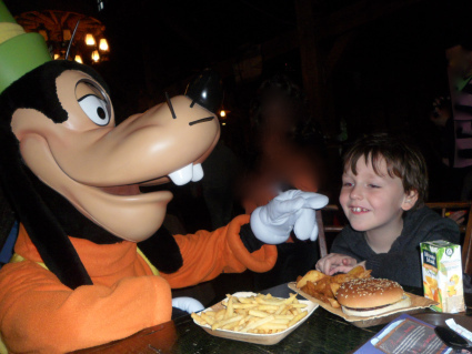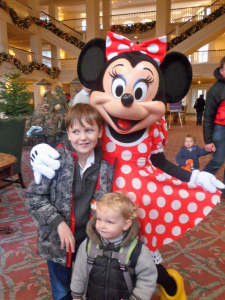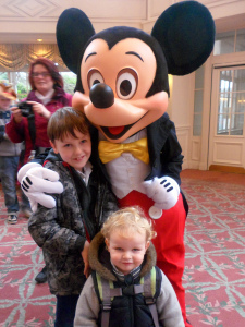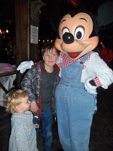 The room was lovely (albeit pretty similar to the room we had in the Sequoia Lodge a couple of years ago) and once the boys had checked out the TV channels and rolled about on the bed, we headed out to the park, meeting Mickey and Minnie on the way: