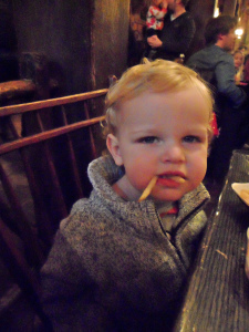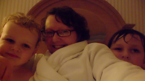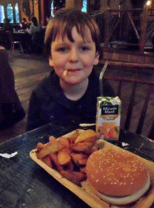 It was raining pretty heavily by then and Joe had had enough and demanded to return to the hotel. So we left David and Harry and went back… where Joe immediately got a second wind and ran from bed to bed. When David and Harry got back, Harry and Joe had a bath and David went to Disney Village to get some food. He returned with burgers, pizzas and a mulled wine for me. Excellent.