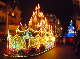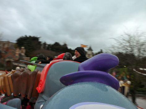 We got something to eat (and had our first "ouch" at the prices) then went on Buzz Lightyear's Laser Blast (I love the animatronic Buzz so much). Joe insisted on going on the Orbitron, even though it was raining by then. I ended up laughing all the way round – a face full of freezing rain! Fun! From there, we went to line up for the parade and on the way Harry said, "Middy, I can't believe you booked Disneyland…" "What do you mean?" "I can't believe you booked it – thank you!" Wibble.