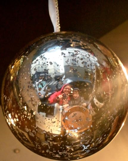 I wanted to show the boys some of the gorgeous Parisian shops, so we crossed back over the river and wandered down a little street lined with bakeries and chocolate shops. Harry and I got crepes (mine was salted caramel, yum) and took a photo of us reflected in a bauble.