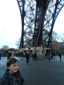 We got the train to the Eiffel Tower and walked towards it with Harry chattering about wanting to go right to the top and Joe saying, "Madeyine sit there!" (Have I mentioned that Joe pronounces his Ls as Ys? So when we got to our hotel he said, "Yook! Yoads a'yights!" [Look! Loads of lights!])