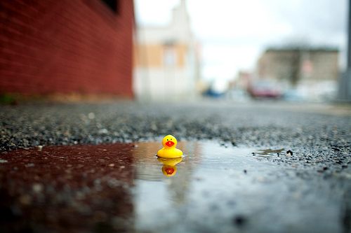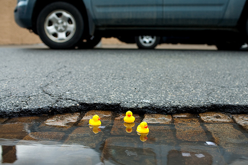 Remember my Prettifying Pavements and Potholes post? Well when Katie Sokoler noticed the forecast was for a week of rain, she decided to turn the puddles into duck ponds.