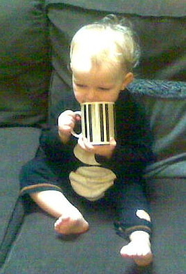 At the weekend, he once again wanted my leftover tea in a mug and since he was sitting nicely next to me on the sofa, I gave it to him. On the coffee table in front of us, there was a biscuit. Joe pointed at the biscuit so I took the tea off him and gave him the biscuit. He wasn't happy. So I took the biscuit away and gave him the tea. Still not happy. So I gave him both and told him to be very careful and to pick up the mug with two hands.