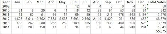 I did this some time ago and I promised to continue to report my sales. I do this because there is no other way for an indie author to know if he or she is doing well compared to other authors. I have said it before and I will say it again, writing--in my opinion--is not a competition. But sales numbers matter. Here are my total book sales since I started keeping records. The jump in November of 2014 is from the release of