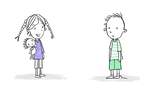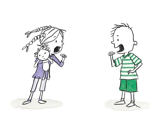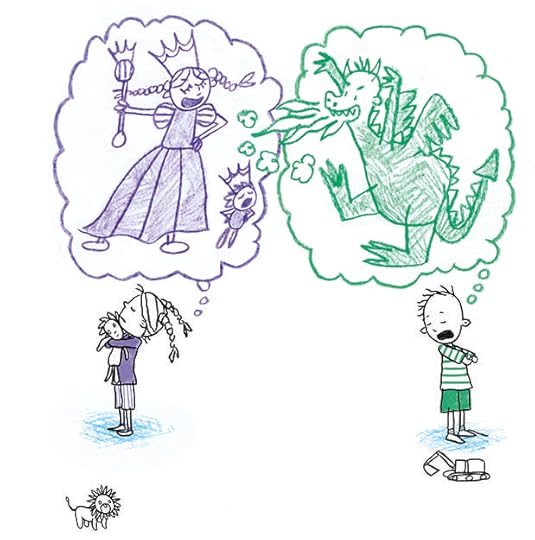 This is a delightful story, told completely through dialogue and illustration (a good mentor text for writers who are working on similar stories.) The writing is spare and there is no written narrative – it’s all a conversation. The girl is completely sure that her idea is best, her game the most fun…and not surprisingly it gives her the starring role. The boy is equally convinced that his totally different idea is best, his game the most fun…and not surprisingly it gives him the starring role :) Anyone who has ever spent time around kids will recognize this dynamic. The children’s imaginative descriptions grow more and more elaborate as they try to convince each other, but it is not to be...