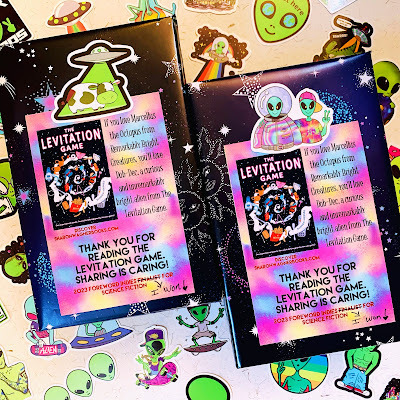 Before sending my freebies into the universe, I wrapped ten books with celestial wrapping paper and far-out stickers. Fun!