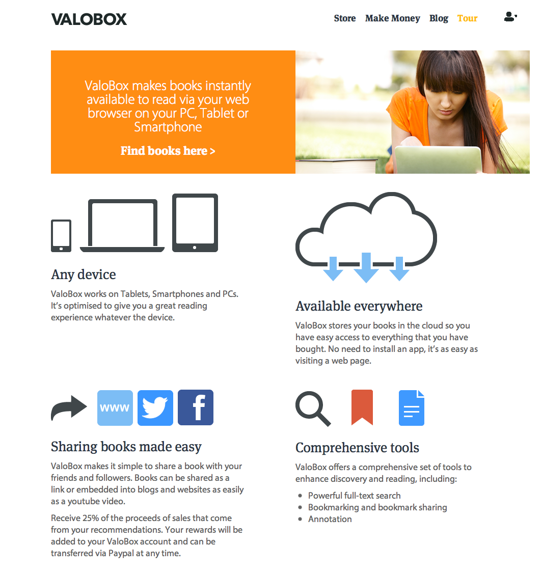 History is littered with startup websites that intended to break the mould. A few did. Many more were themselves broken by the market. Because what seems a good idea in your garage doesn't necessarily make a lot of sense when it becomes available to the world.I am honestly undecided about one such new website in the publishing field, Valobox. It is, they say, a new way of accessing ebooks. The idea is that you can take a look at an ebook online, read a chapter free and then either buy the whole book or individual chapters at a time. It is all done in the browser, so there are no apps and it works on anything that can run a browser.