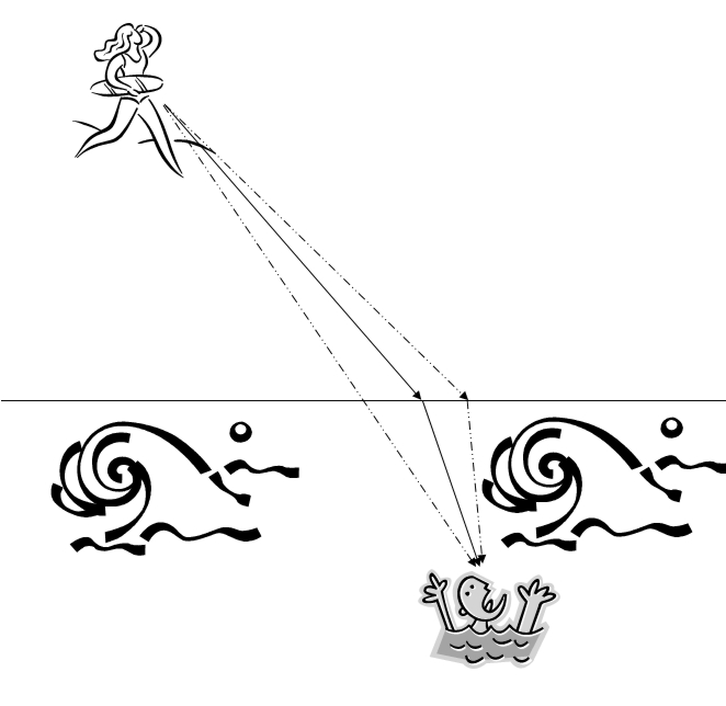 This principle is applied to light by considering time. The principle of least time says that light takes the quickest route. Fermat had to make two assumptions – that light’s speed isn’t infinite (the speed of light was yet to be measured in 1661 when Fermat produced this result), and that light moves slower in a dense material like glass than it does in air. We are used to straight lines being the quickest route between any two points – but that assumes that everything remains the same on the journey. In the case of light going from air to glass, bending is the quickest route. To see why this is the case, compare the light’s journey to a lifeguard, rescuing someone drowning in the sea. The obvious route is to head straight for the drowning person. But the lifeguard can run much faster on the beach than in the water. By heading away from the victim, taking a longer path on the sand, then bending inwards and taking a more direct path in the water, the lifeguard gets there quicker.