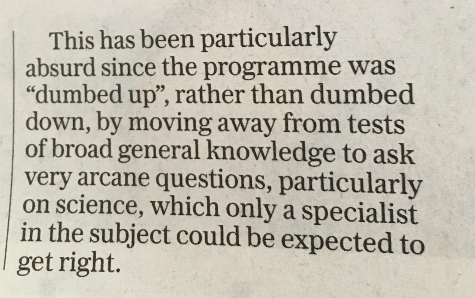I rarely see the Daily Telegraph, but at the weekend I was at the house of someone who takes it. I couldn't help become a little incensed at an opinion piece by someone called Christopher Booker, bemoaning the 'dumbing up' of University Challenge. Given the proximity to the world marches for science, I couldn't help comment on the piece.Famously, C. P. Snow once made a big thing of the 'two cultures' of the arts and sciences, pointing out that people from the arts side expected a well-educated person to have a good knowledge of the arts, but themselves expressed a kind of smug satisfaction in their ignorance of the sciences.