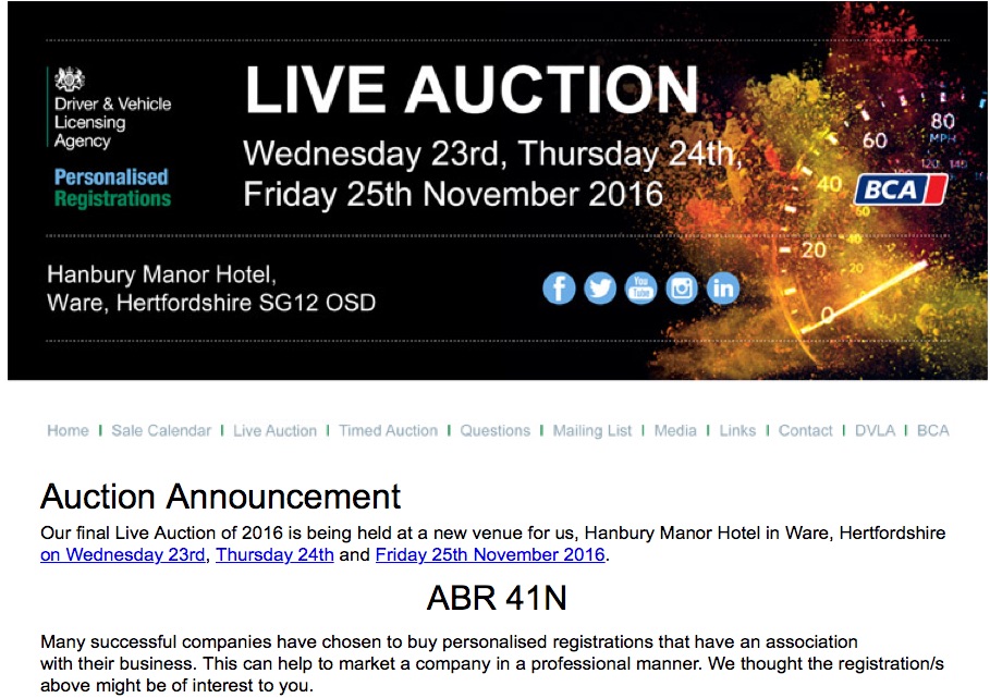 In amongst the spam and oddities that appear in email there is occasionally an official one that causes some confusion - and I got such a mail today. It was from the DVLA, and as far as I can tell it was genuine. And it was advertising an auction of personalised car registrations.