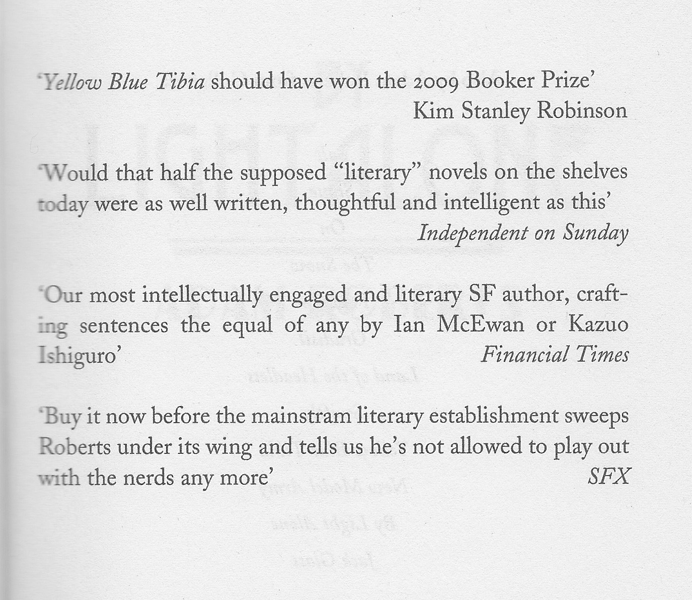 Perhaps because of my Northern working class family background, I struggle when presented with what appears to be pretentiousness. I know, for instance, that caviar is a horrible, salty waste of money, I prefer a good draught beer to wine with a meal, and I have real trouble with the literary scene.The vast majority of the time I prefer to read genre fiction, whether crime or SF, rather than reading literary fiction. I'd go further - I think good genre writing is better fiction than most literary fiction. So I have real mixed feelings about seeing the quotes alongside in the Adam Roberts book By Light Alone, which I recently reviewed.