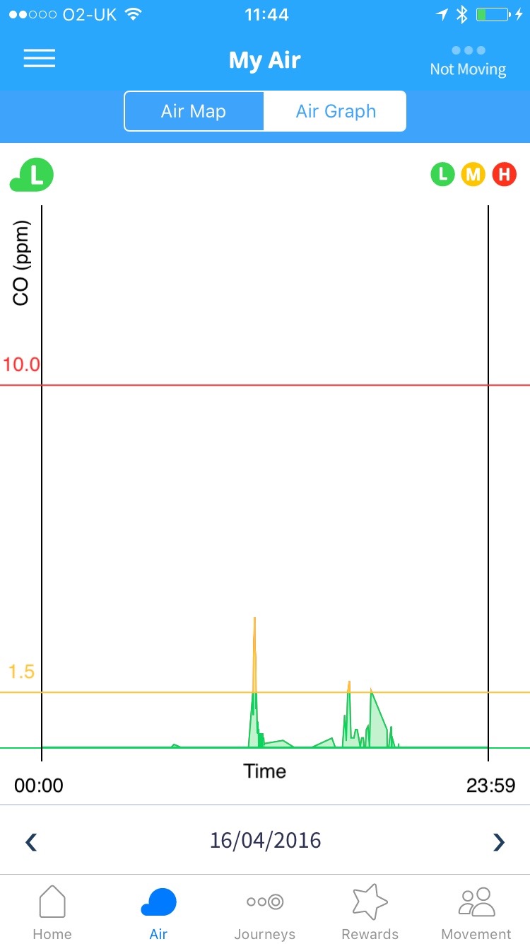 You can take a look at your air quality exposure as a graph showing peaks, or as a map, which seems to combine the data from any tag it can lay its hands on to give the best picture it can of its surroundings.