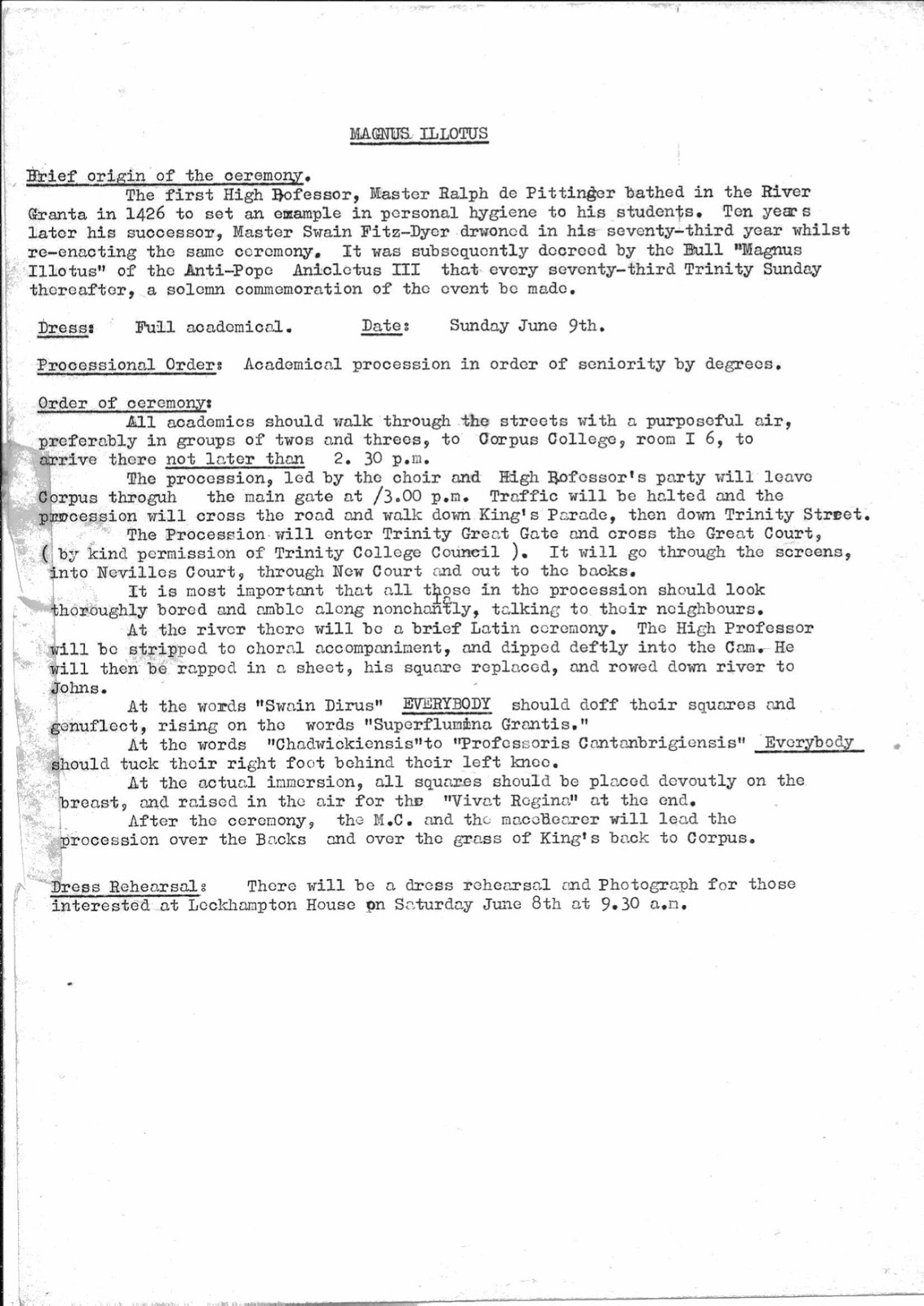Way back in 2009 I wrote here about a remarkable, large scale practical joke I took part in when at university. It was a made-up ancient ceremony, for which the traffic was stopped by the police, so that a large procession could go down King's Parade, through Trinity College and onto the backs by the river, where a bizarre ceremony took place. I recently received an email asking for any details I had, so dug out of the loft my original instruction sheet, which I thought would make an appropriate entry for 1 April.