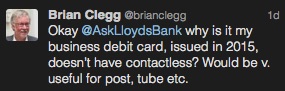 I used Twitter to bring the above moan to the attention of my bank. Lloyds makes it clear just how much it regards Twitter as a way to ask it questions from the name 'AskLloydsBank.' It seemed a reasonable question - I've a relatively new business debit card, yet when I buy stamps or travel by tube, for instance, I can't use my card to pay contactless.