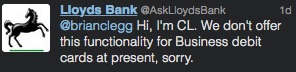 To be fair to the Lloyds staff, at this point the actually read the question. (It's not just Lloyds. As anyone who has ever tried to use Amazon, eBay or Paypal customer service will know, they never read the question properly first time, churning out a knee-jerk reply.) Unfortunately, the response was not one to cheer my heart: