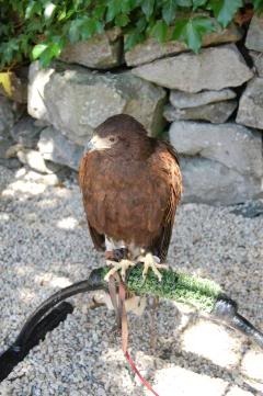 And, finally, it was time to learn to fly them. We learned to send them off by holding out our arms and stepping forward. And then learned to call them back by standing sideways and holding out the arm the back of the hand toward them and a bit of raw meat clenched in the glove. Also learned that our guide had to give us the food in secret, or the birds would come back before being called—a no-no. Also a no-no to let them have the food until both birds had come back, which meant sometimes you had a bird pecking at the glove for a minute or two if the other was being lazy. It was absolutely wonderful, even if Cara was feeling a bit lazy that day and sometimes took a while to come back. I had been a tad worried having a bird with a huge sharp beak and talons on my arm, but once we had them I never felt nervous at all. Being able to see them up close—the way the feathers layer over one another and the color of their eyes and the bright yellow of their feet—was amazing, utterly amazing. We walked all over the castle grounds to fly them, though we had to leave the wooded area pretty quickly when Rua thought she saw an actual animal and wouldn’t come back for a while. The way we got her back was to go over and pretend to try to flush the animal out for her—that way she felt like we were equal hunting partners and that we’d done out best to look for it.
